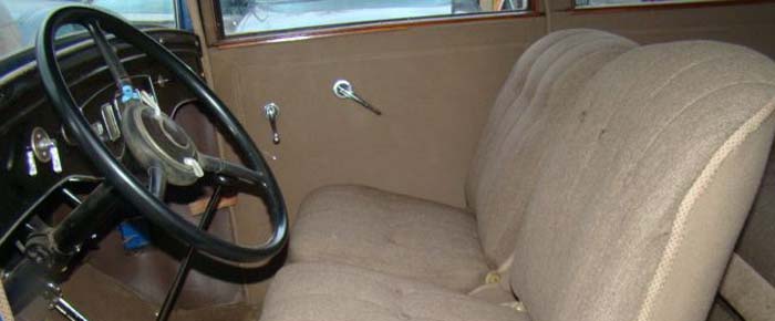 Here you can see the interior of the 1929 Pierce-Arrow. You can see in this picture, that there is wood trim around both the front and rear side windows. |